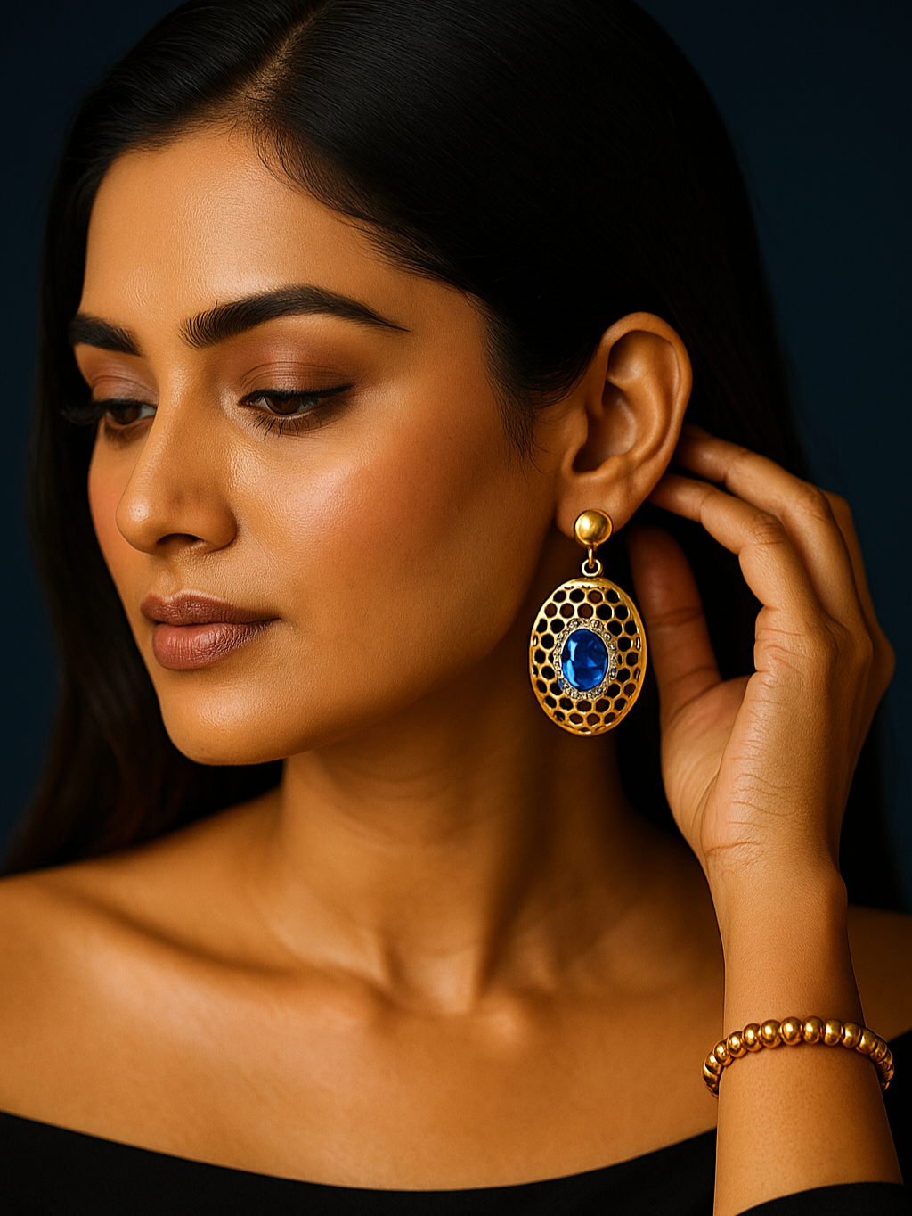 Add a touch of royal sophistication to your outfit with these stunning gold oval drop earrings featuring a deep blue gemstone centerpiece. Surrounded by delicate crystals and intricate cutout detailing, the design combines classic elegance with a contemporary finish.